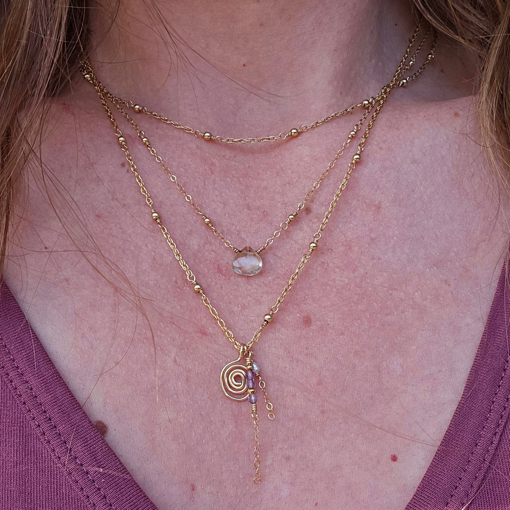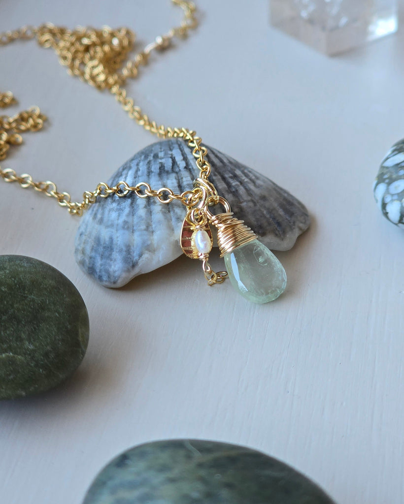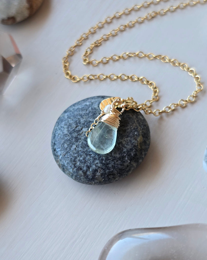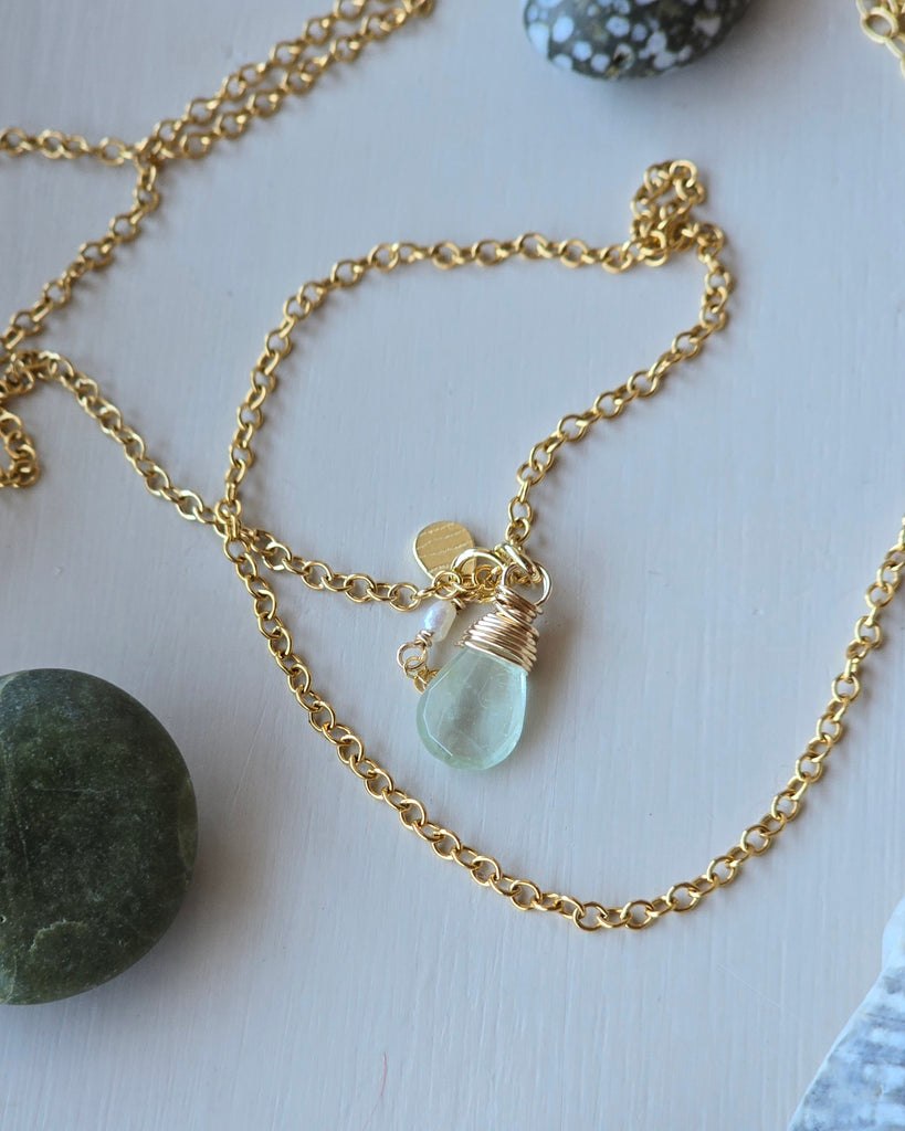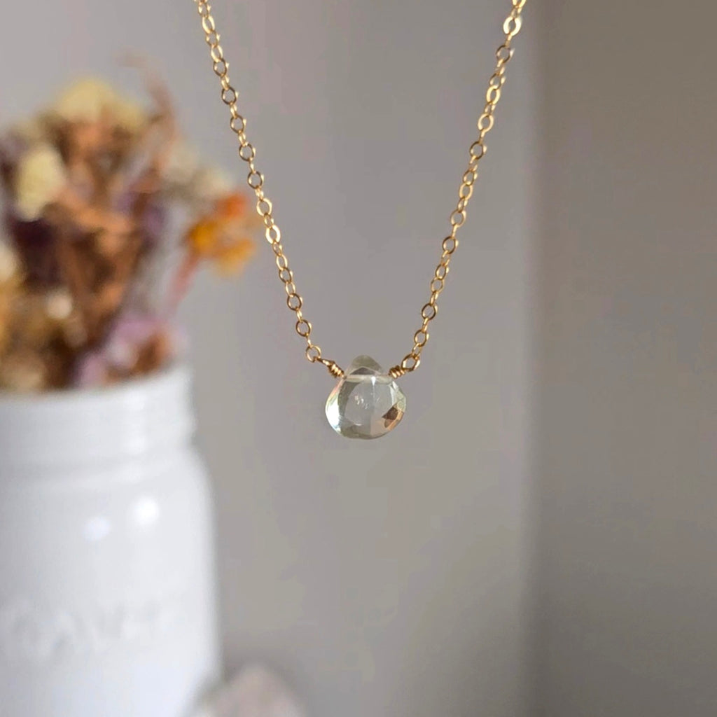 Made by hand, this beautiful necklace features a genuine Prasiolite crystal, sitting pretty on a handmade gold filled chain. This necklace is adjustable in length, the extension chain allows you to wear it closer to your heart chakra, helping to nurture emotional balance.