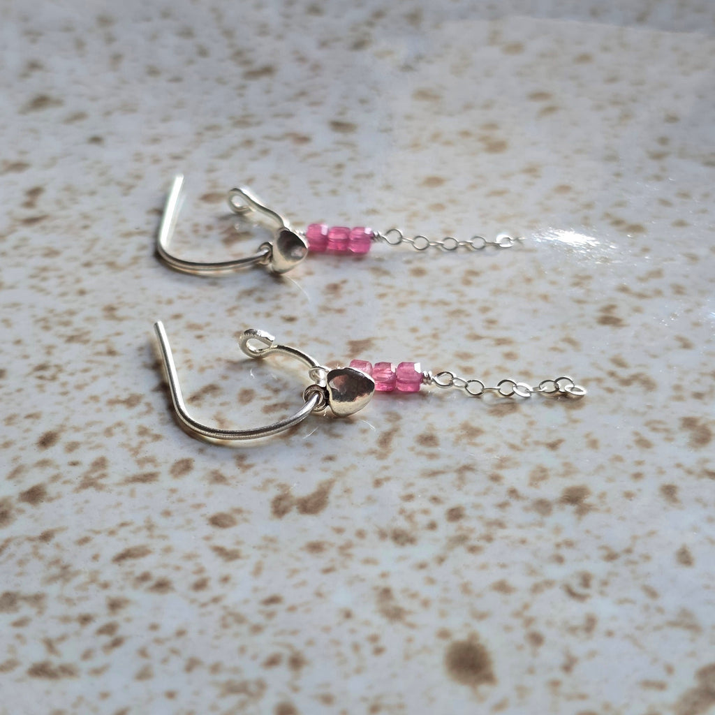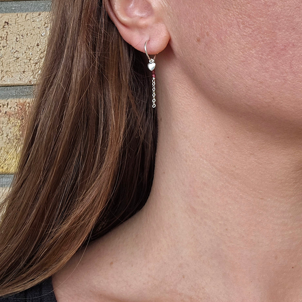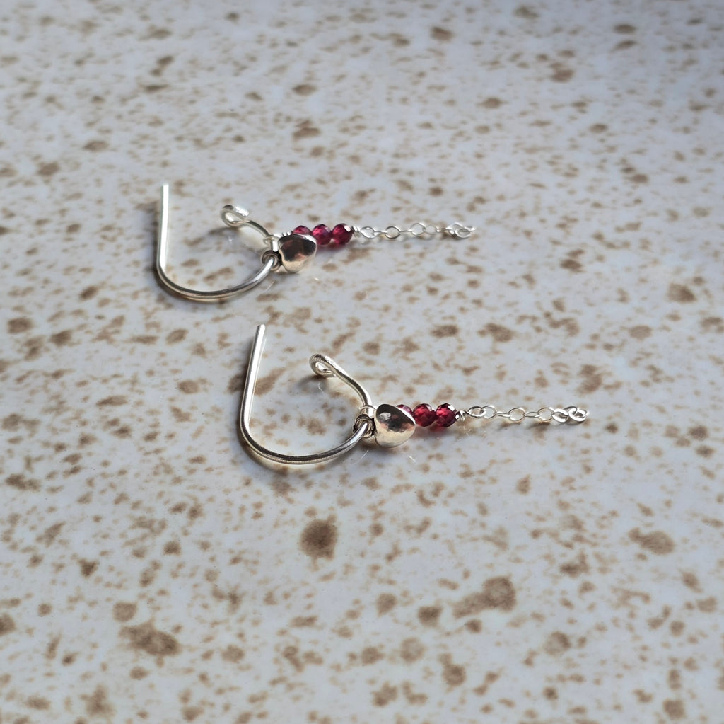The perfect everyday hoop. Handmade with beautiful natural garnet and your choice of tiny silver hearts or stars.