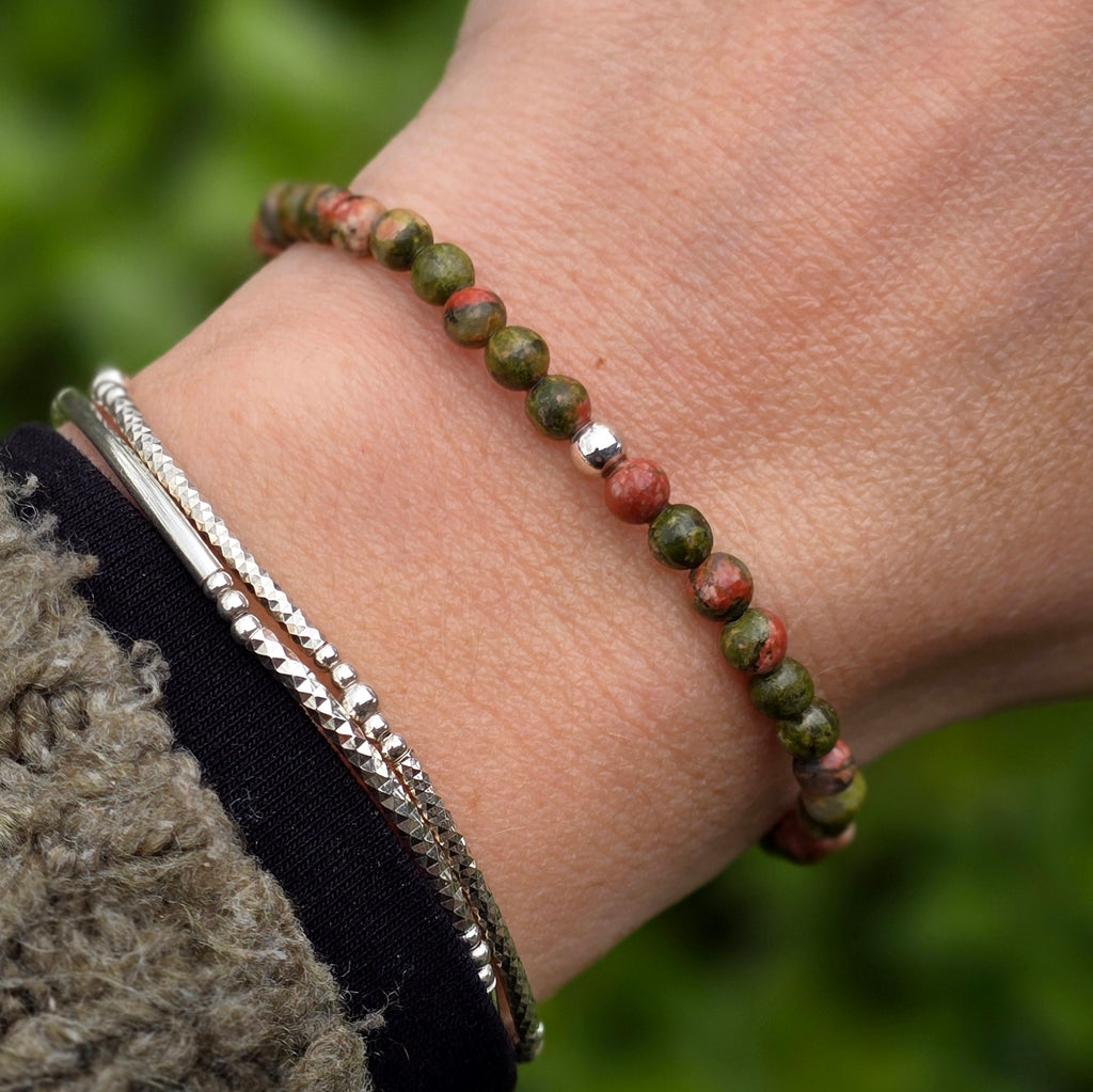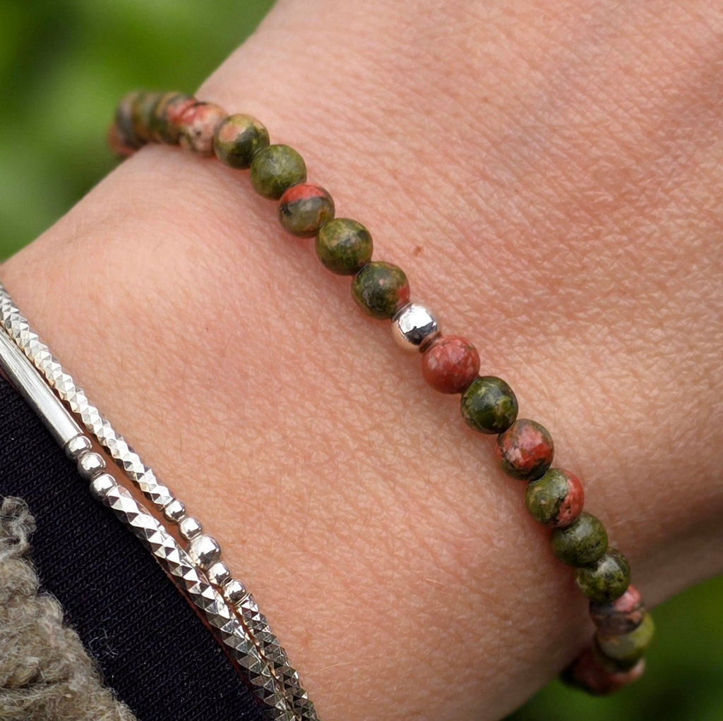 Natural Unakite stretch bead bracelet. Made with 4mm round gemstone beads and a wee sterling silver accent bead.