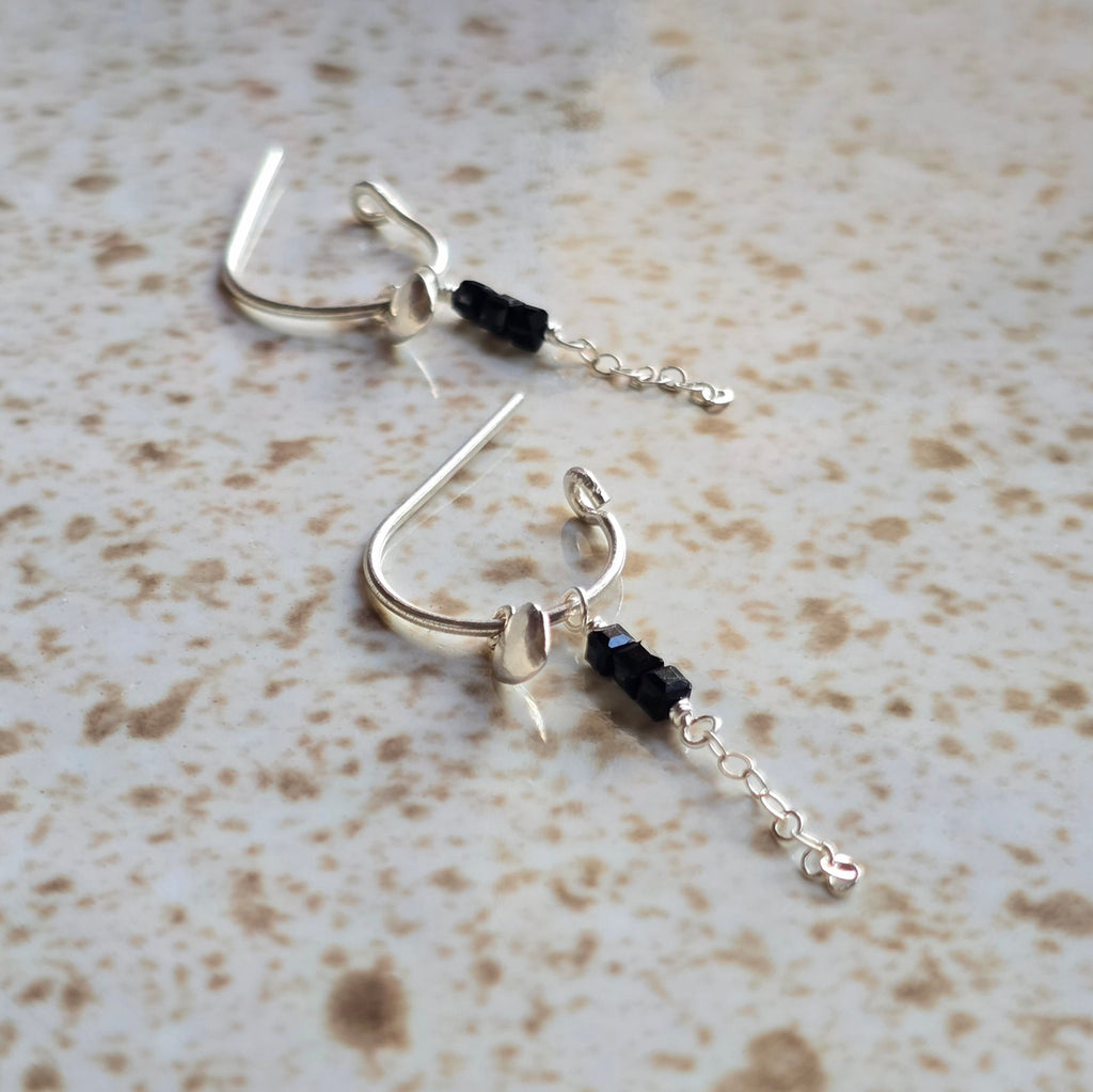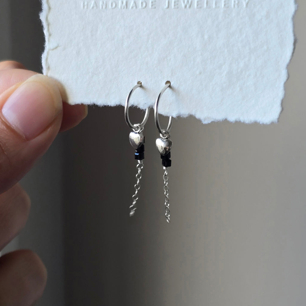 The perfect everyday hoop. Handmade with stunning black tourmaline and your choice of tiny silver hearts or stars.