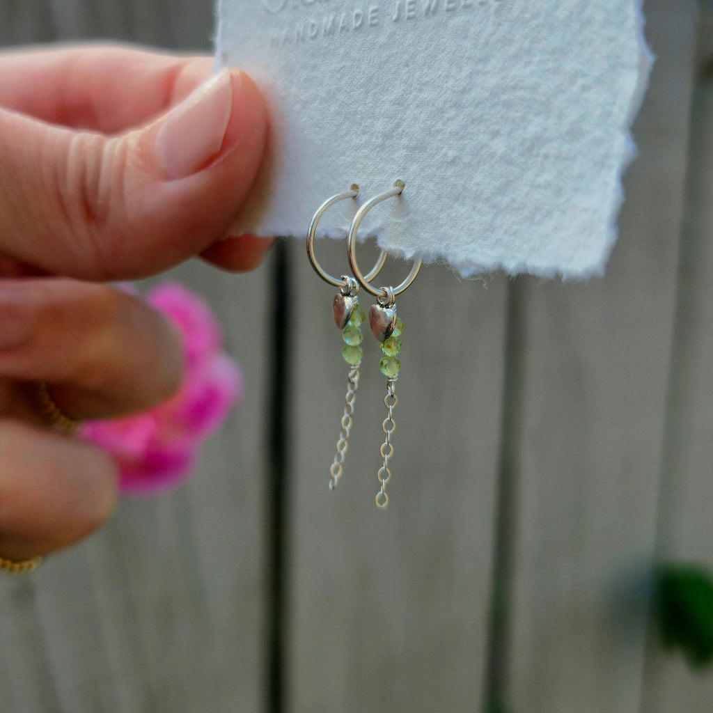 The perfect everyday hoop. Handmade with beautiful peridot and your choice of tiny silver hearts or stars.