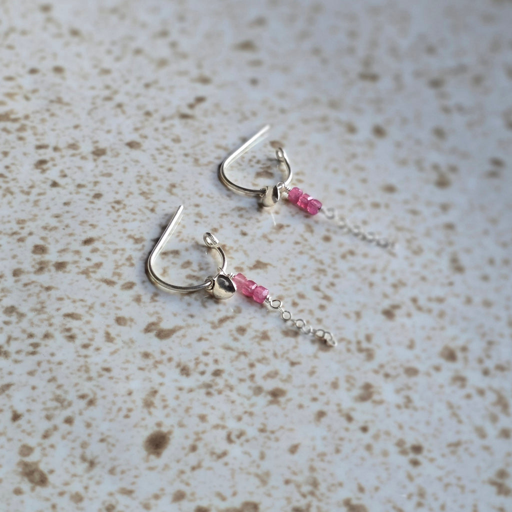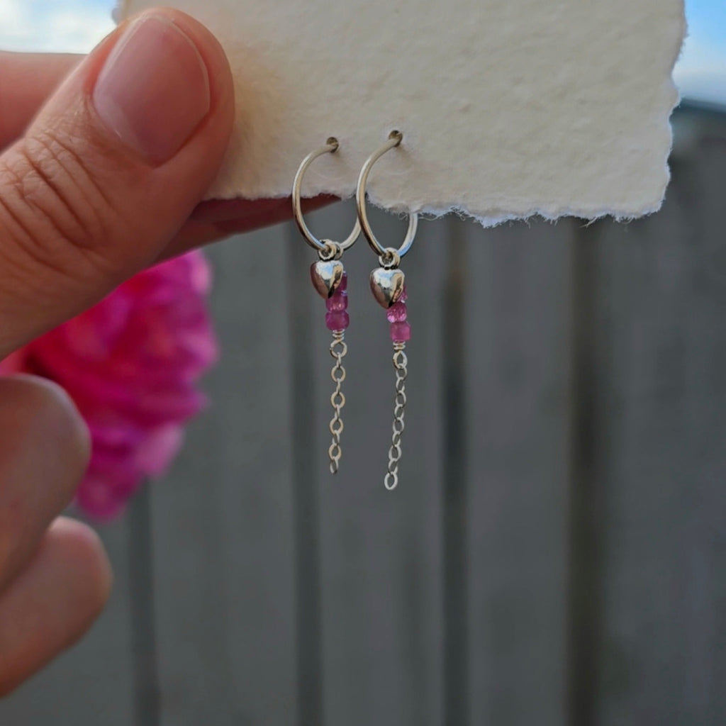 The perfect everyday hoop. Handmade with stunning pink tourmaline and your choice of tiny silver hearts or stars.