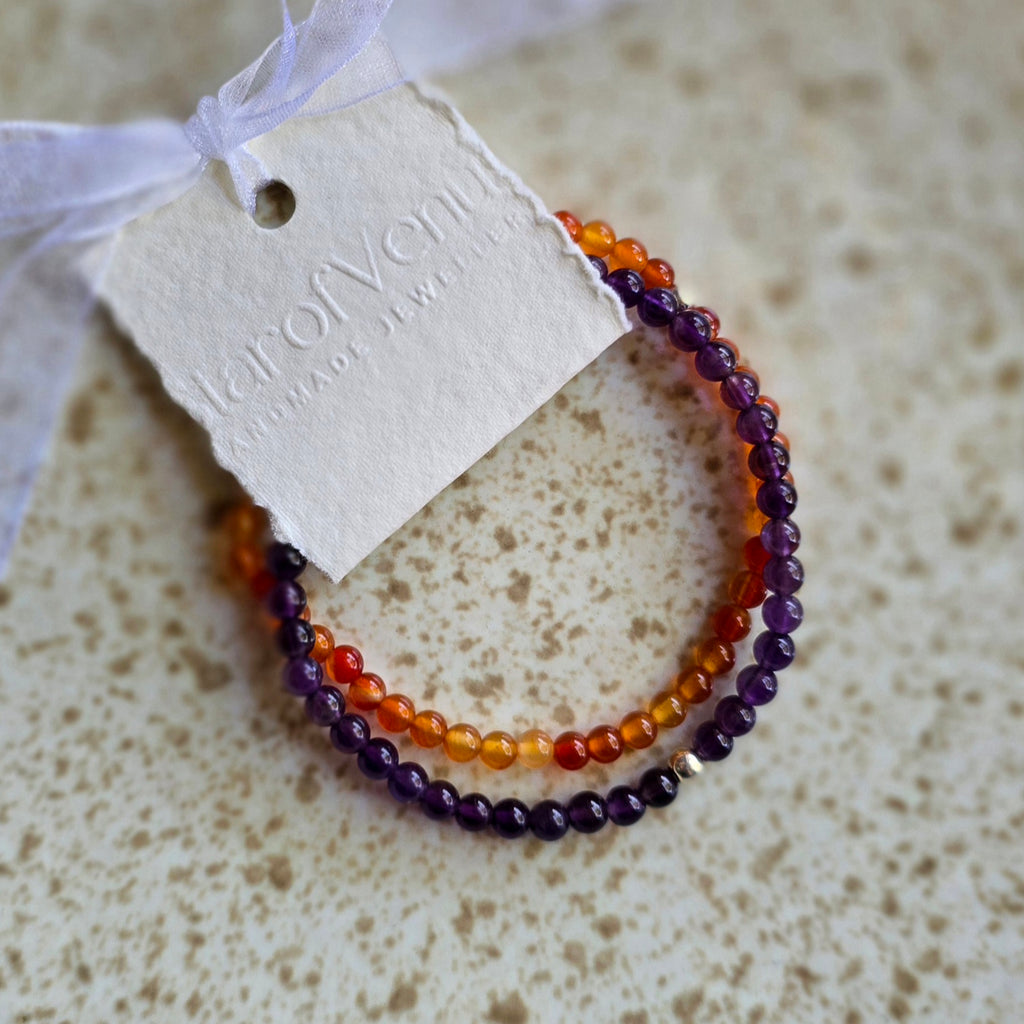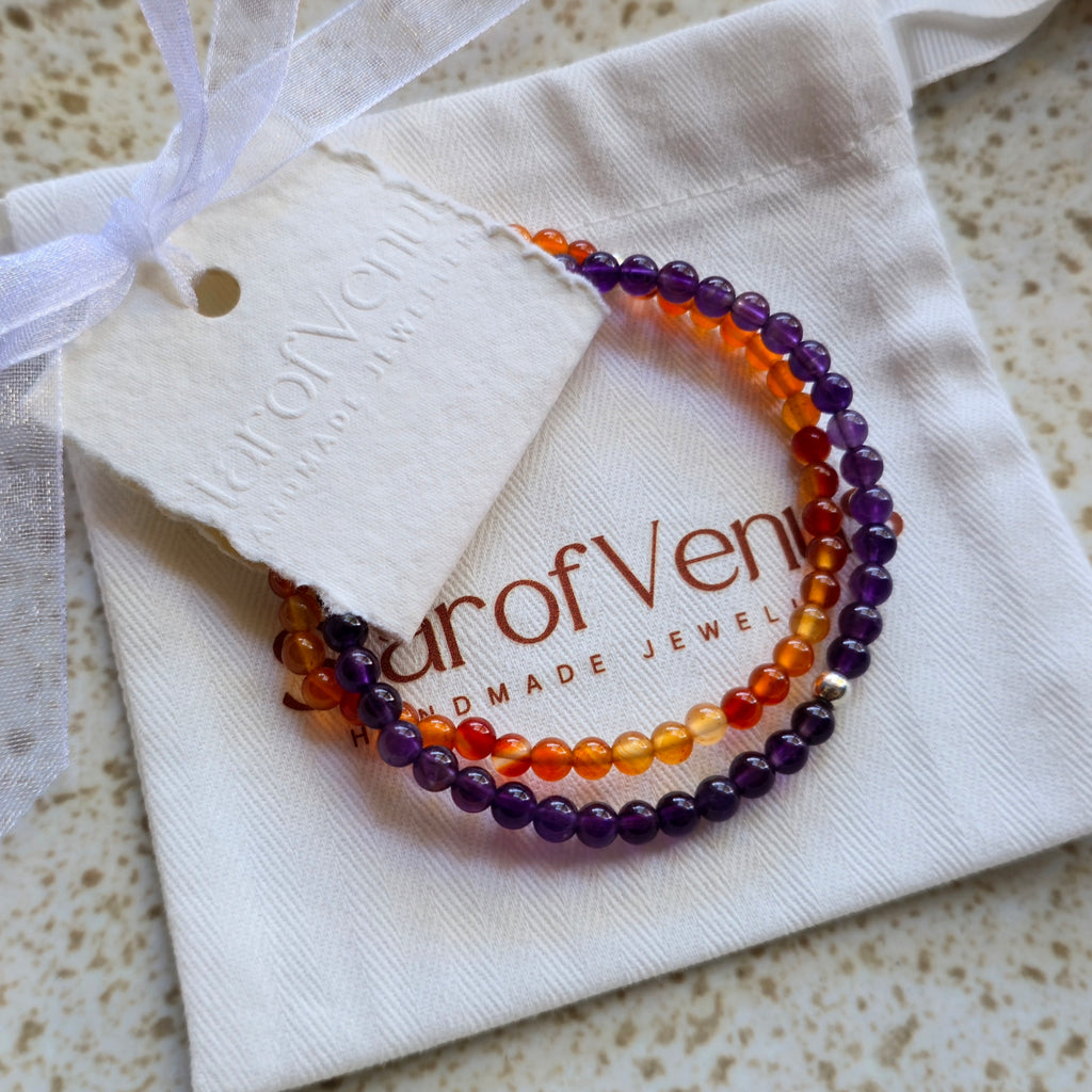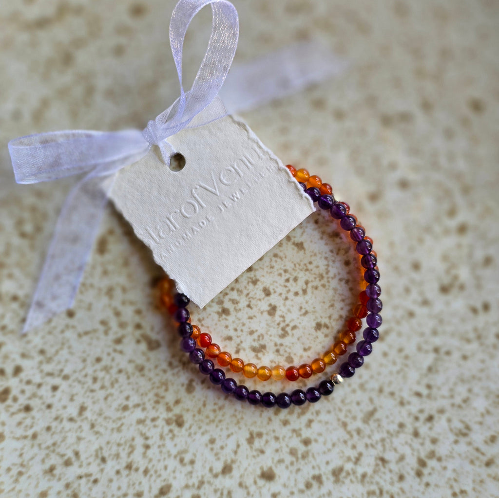 You'll find a dark purple natural Amethyst stretch bracelet paired with a vibrant Carnelian bracelet. Each bundle is presented with a cute little bow and wrapped in soft tissue paper, all tucked into an adorable cotton drawstring bag.