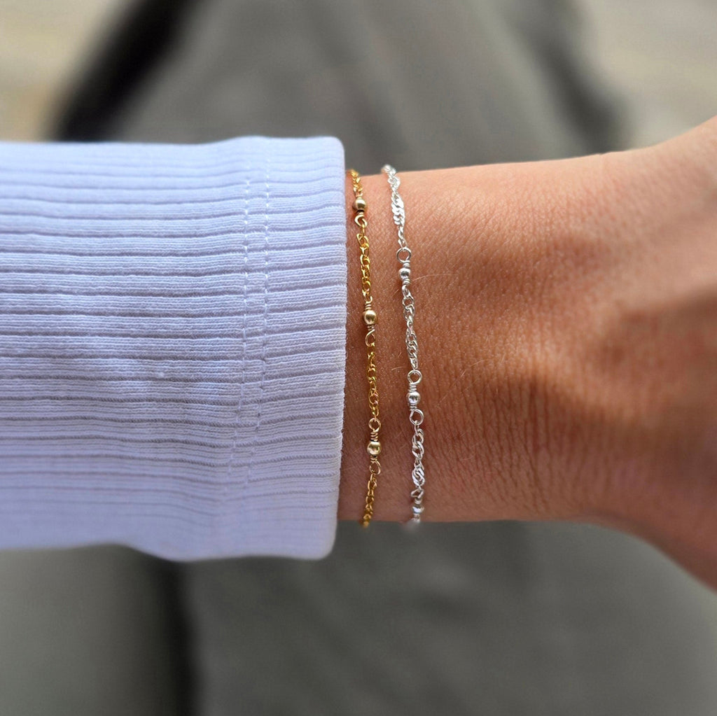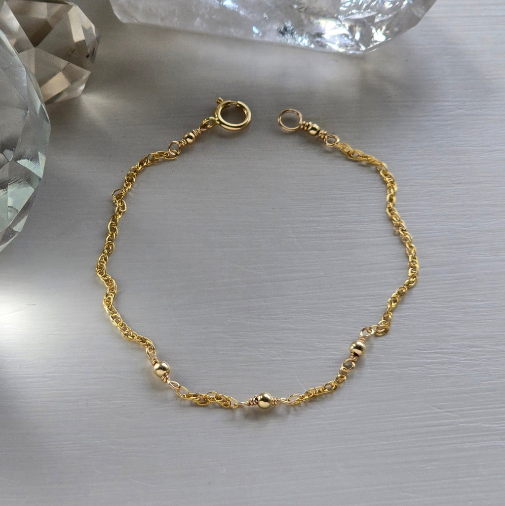 A stunning gold bracelet, handmade using a wave-style chain that gives flow and movement, with the addition of 3 tiny golden beads. Perfect for everyday, or layered with other bracelets for an evening look. Like the sun, gold offers warmth and good vibes.