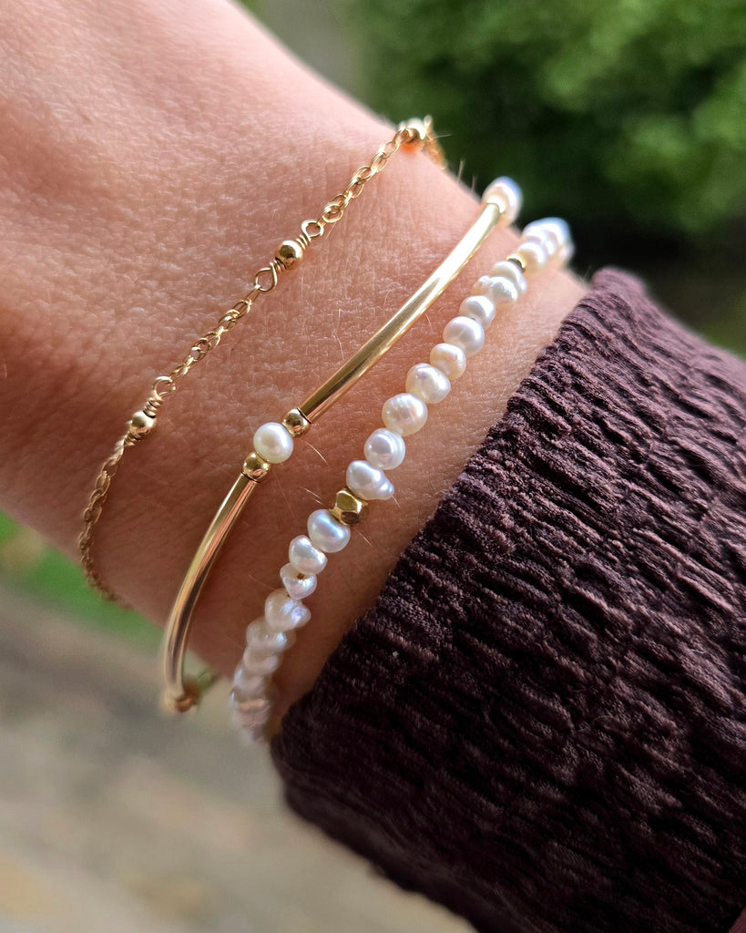 Simple and charming pearl bracelet with golden accents. Handmade in New Zealand with genuine pearls. Only 2 available, 16cm with 3cm extension chain. Comes beautifully wrapped!