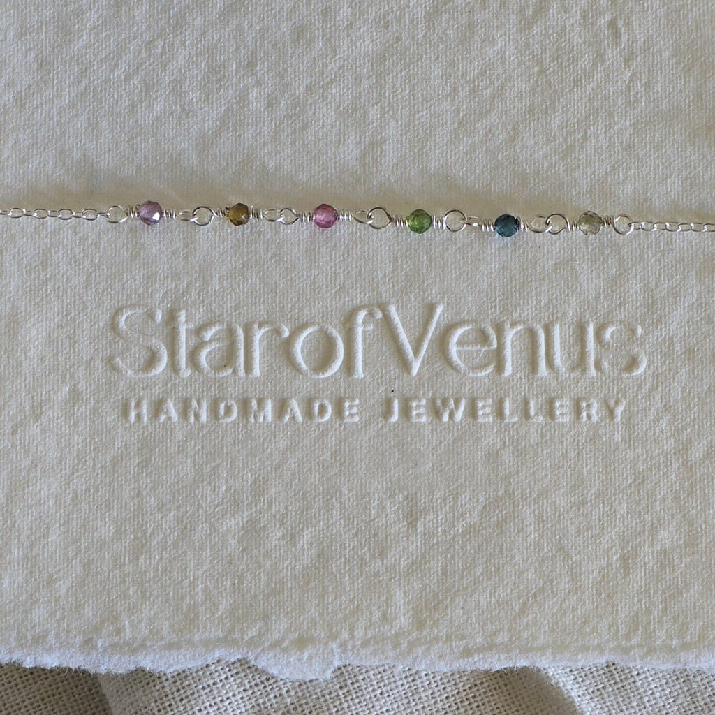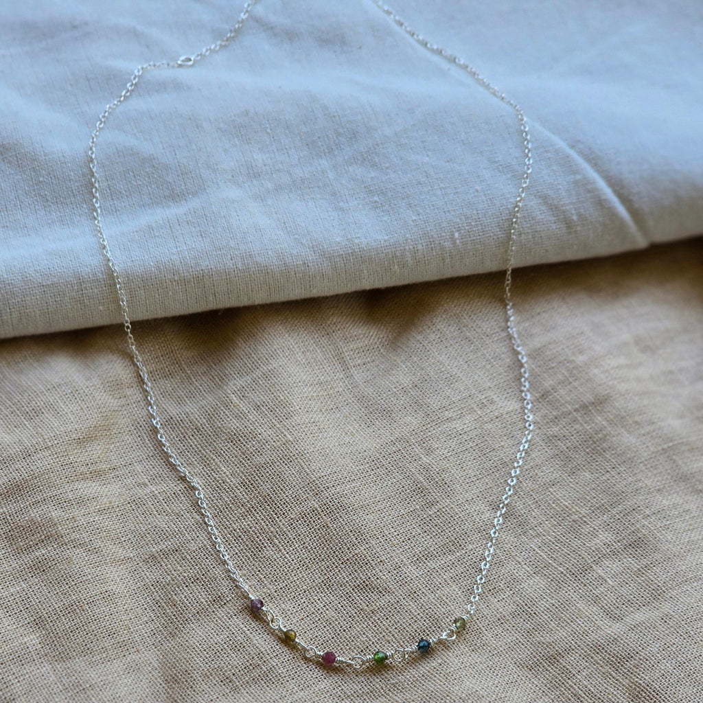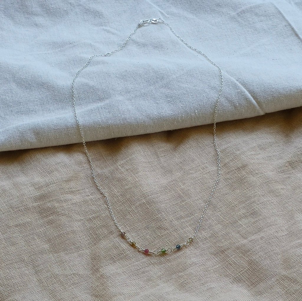 A dainty, everyday necklace featuring beautiful rainbow tourmaline. There are six tiny stones ~ six in numerology represents love, harmony and caring for others. It can either be worn at the base of the neck or slightly lower using the extension chain.