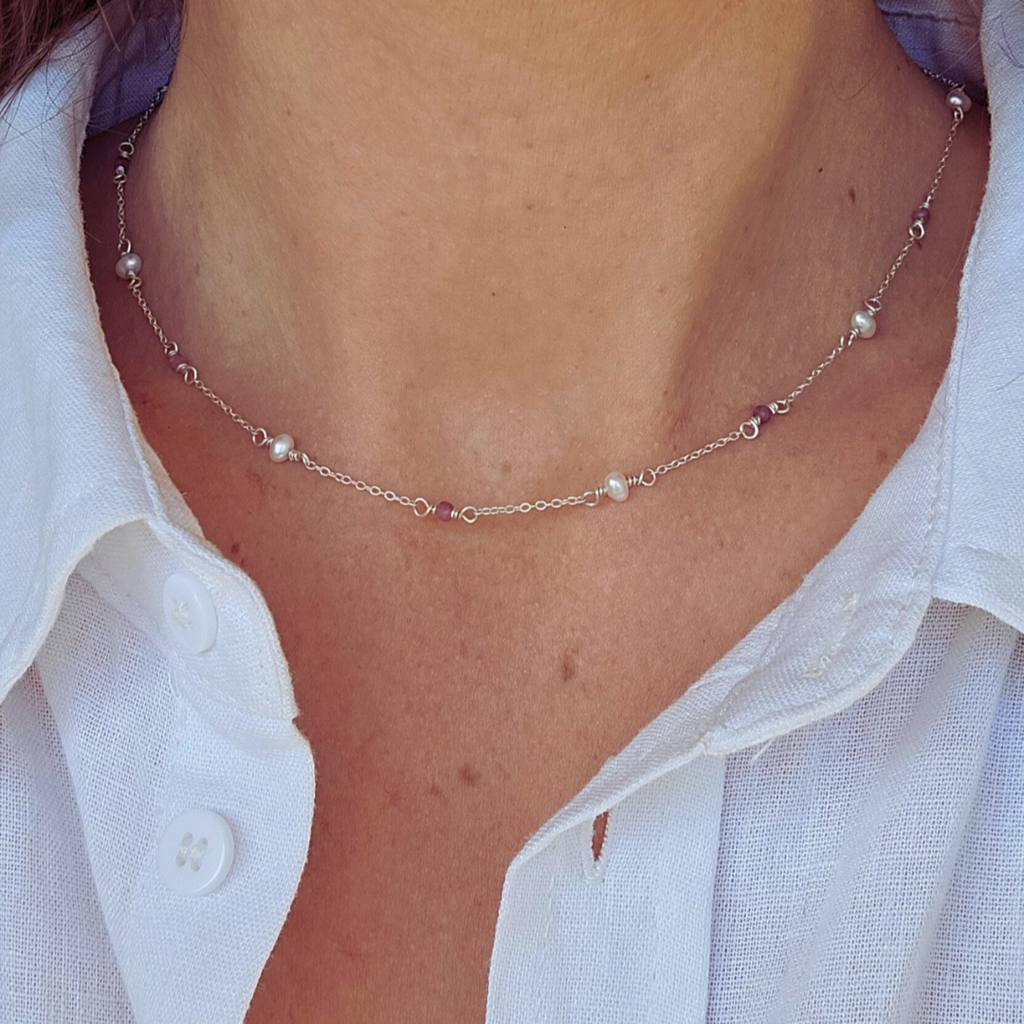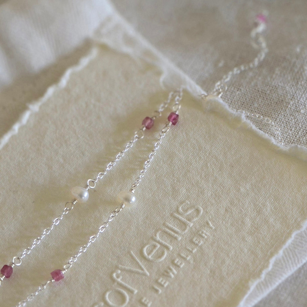 Celebrate playfulness and feminity with our delicate rosie necklace, featuring pink tourmaline and pearl, each precious little gem is lovingly hand wrapped in sterling silver and set within a delicate flowing chain.