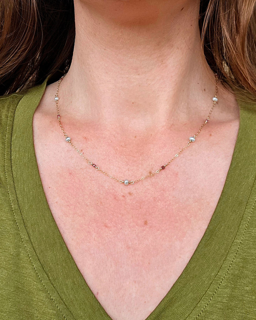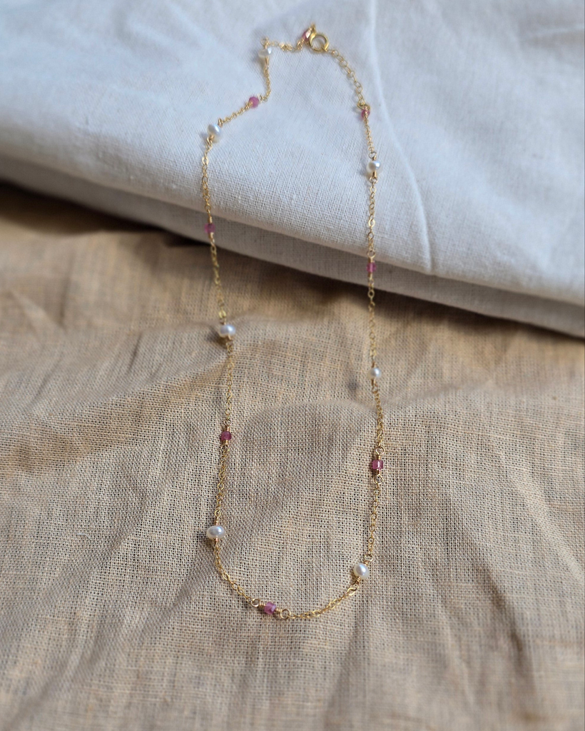 Rosie Necklace | Pink Tourmaline + Pearl | Gold