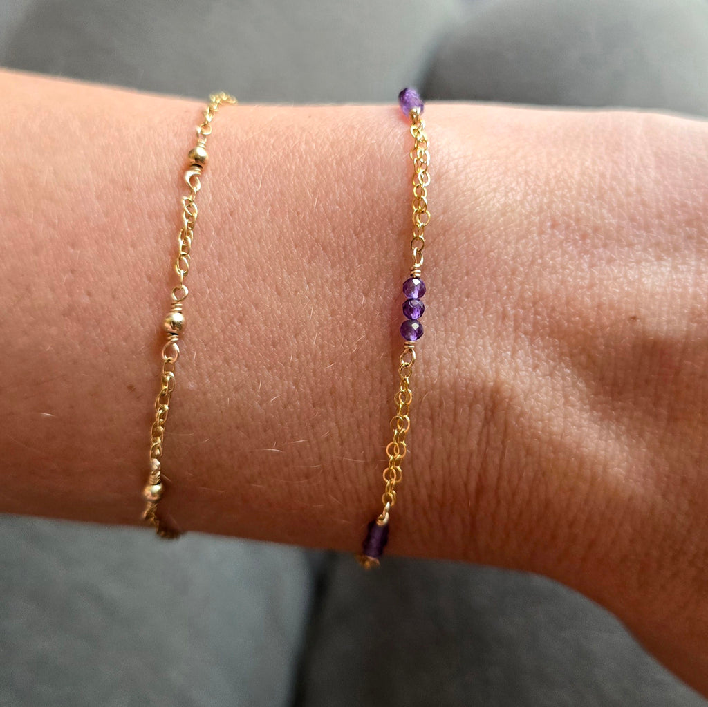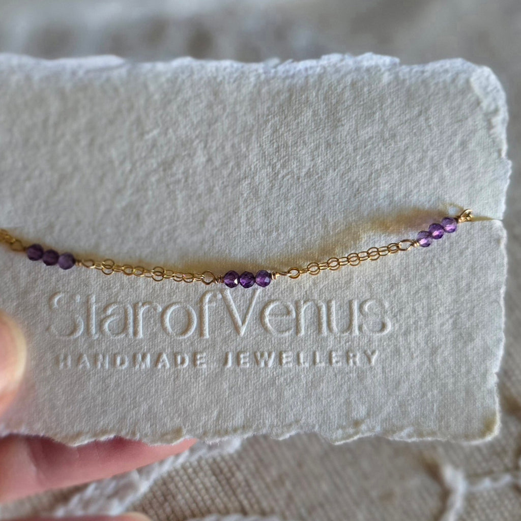 A dainty gold filled bracelet, handmade using genuine faceted-cut amethyst crystals. This bracelet is elegant and refined. Let amethyst guide you on your spiritual quest towards love and unity.