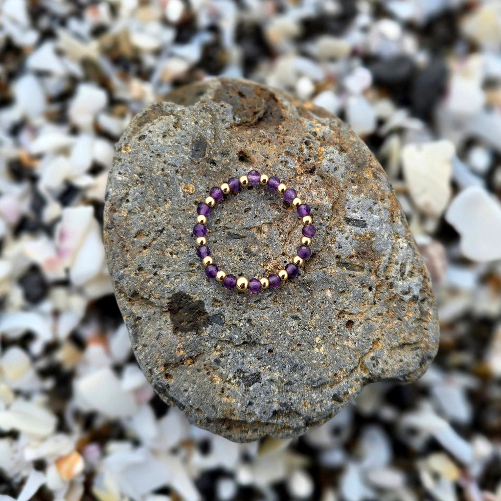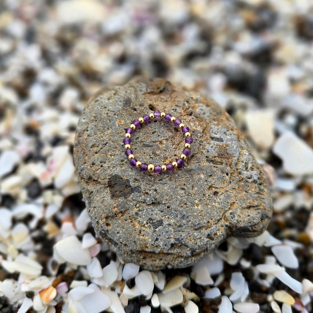 This adorable ring is created with comfort in mind, thanks to its stretchy elastic cord. It showcases little amethyst crystals and delicate gold-filled beads, hand-strung onto durable stretch cord.