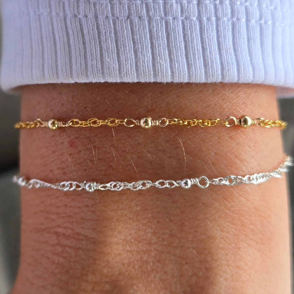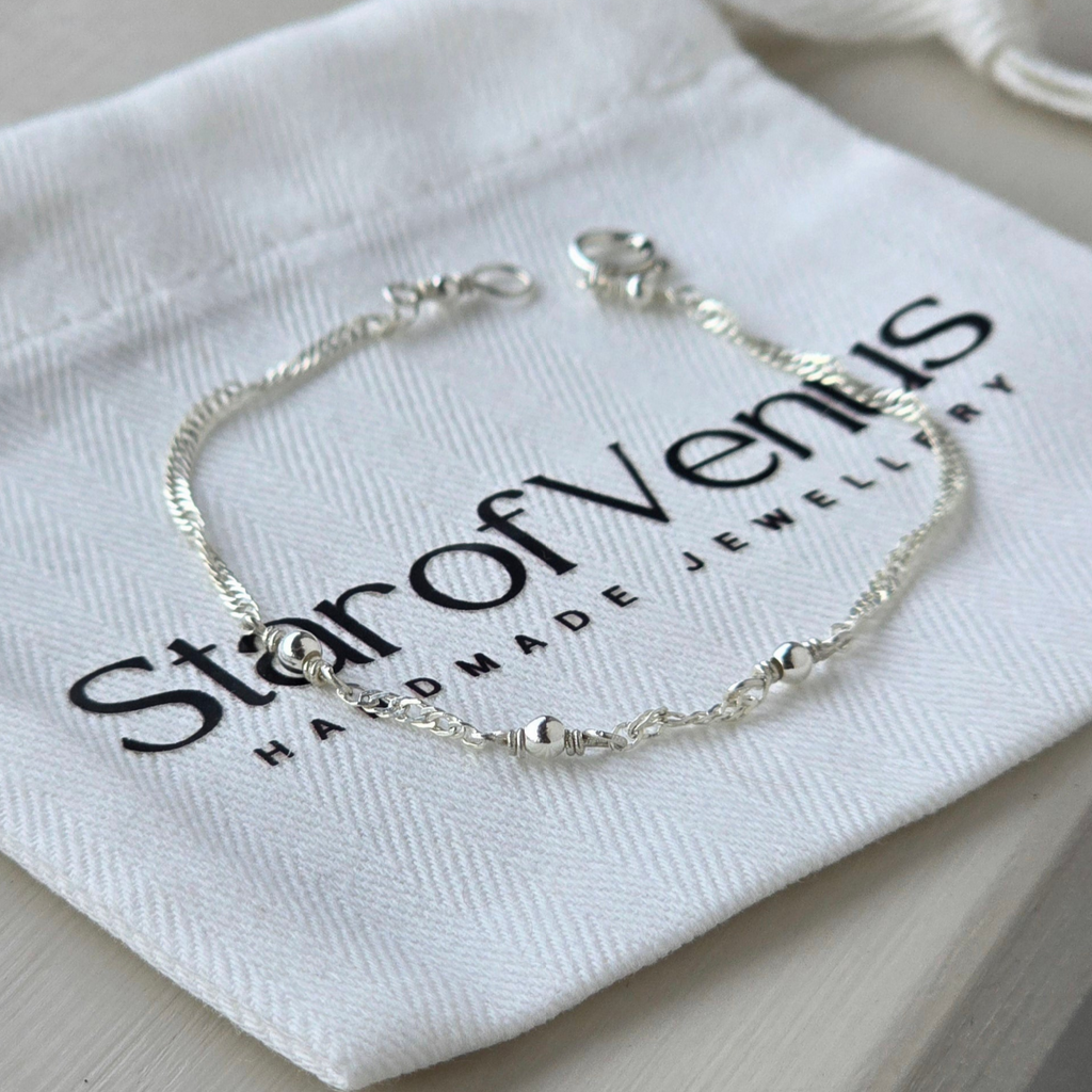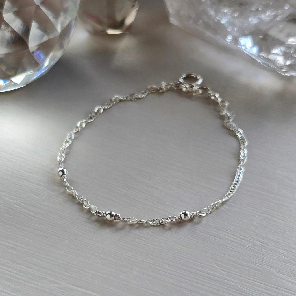 A stunning silver bracelet, handmade using a wave-style chain that gives flow and movement, with the addition of 3 tiny silver beads. Perfect for everyday, or layered with other bracelets for an evening look. Like the moon, silver offers illumination, wisdom and healing.