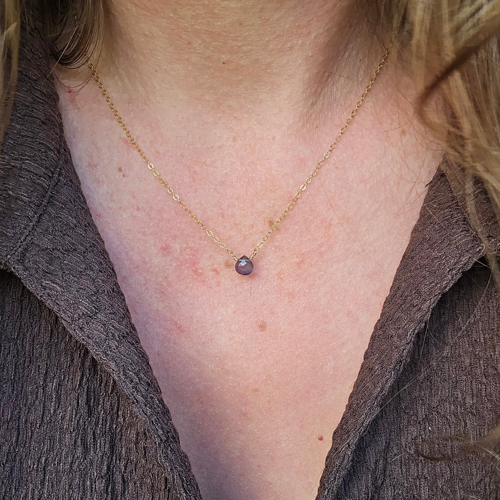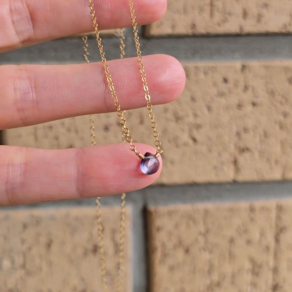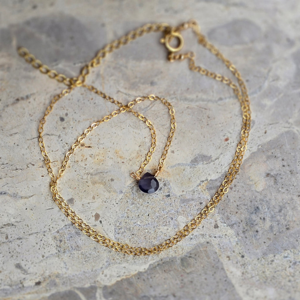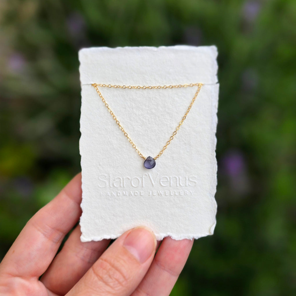 A stunning handmade necklace, featuring a tiny violet-blue Iollite crystal. Handcrafted for woman who appreciate simplicity. This necklace can be worn at different lengths using the extension chain.