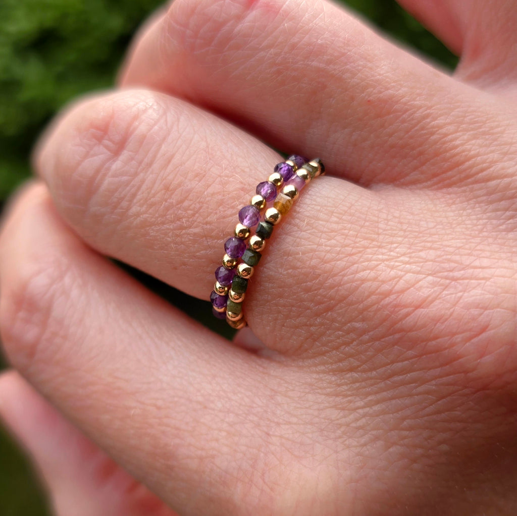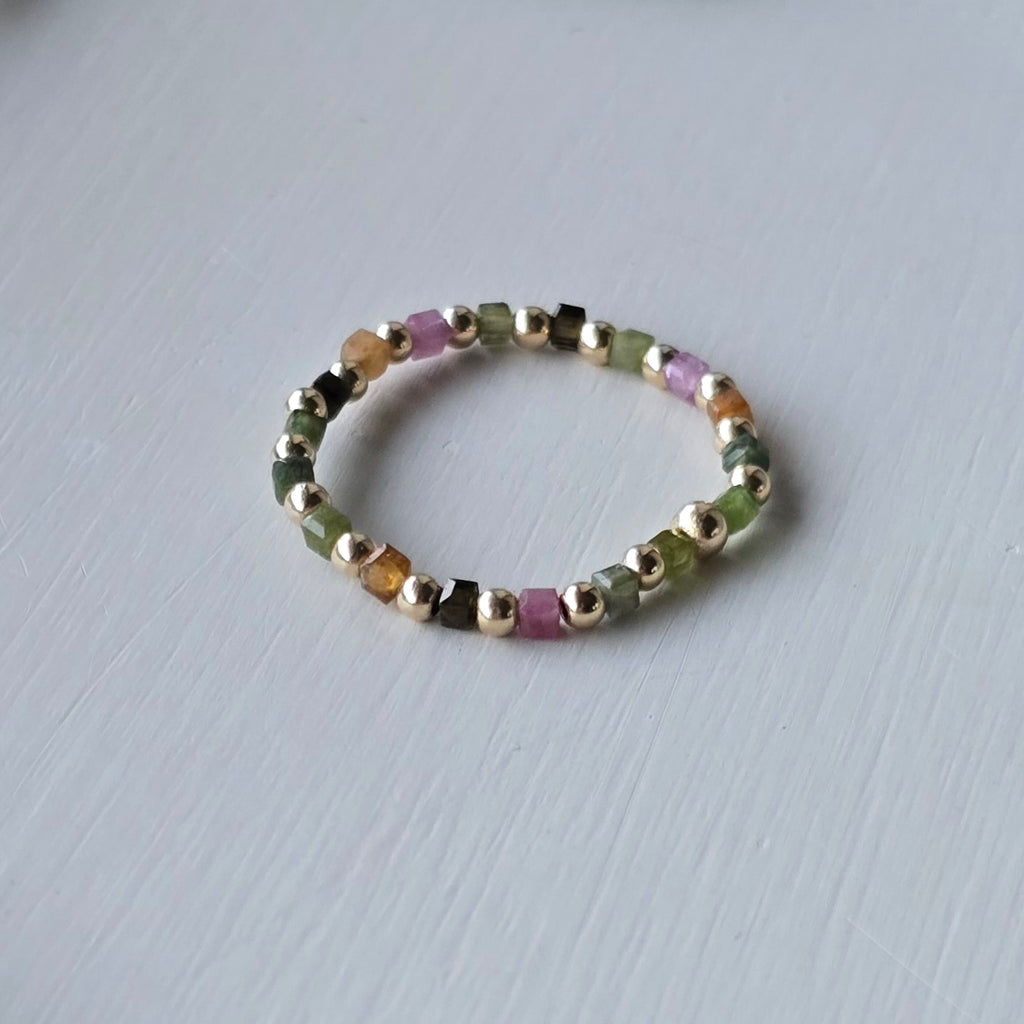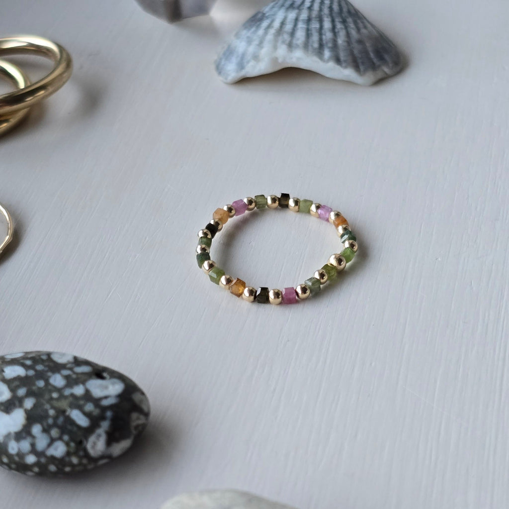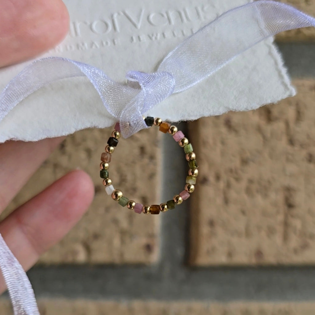 This cute little ring is created with comfort in mind, thanks to its stretchy elastic cord. It showcases a variety of tiny tourmaline stones and delicate gold-filled beads, hand-threaded onto durable stretch cord.