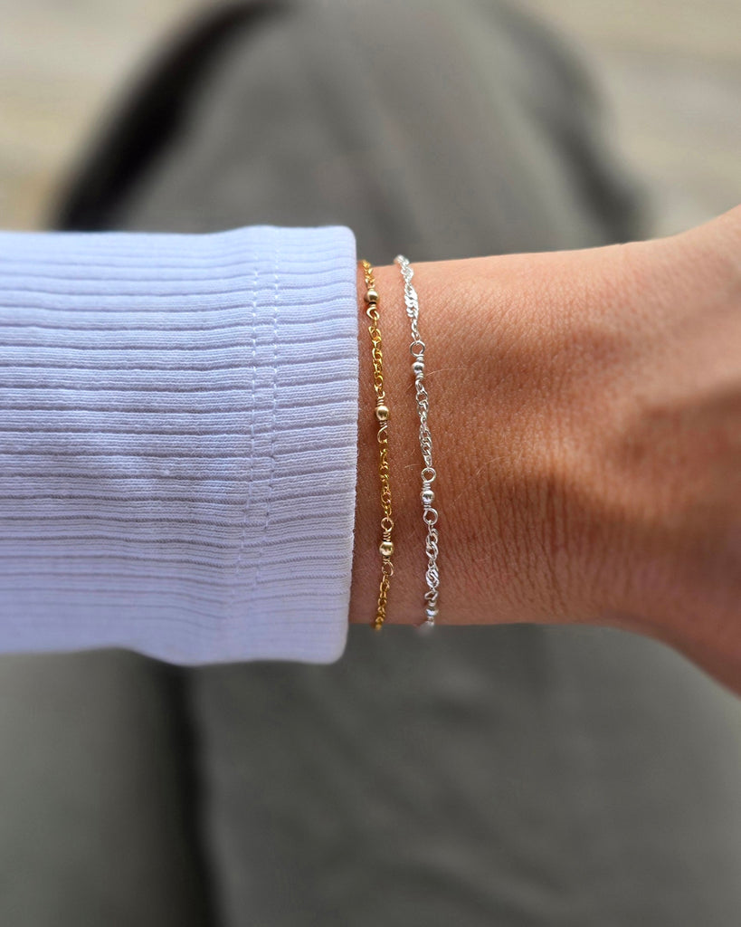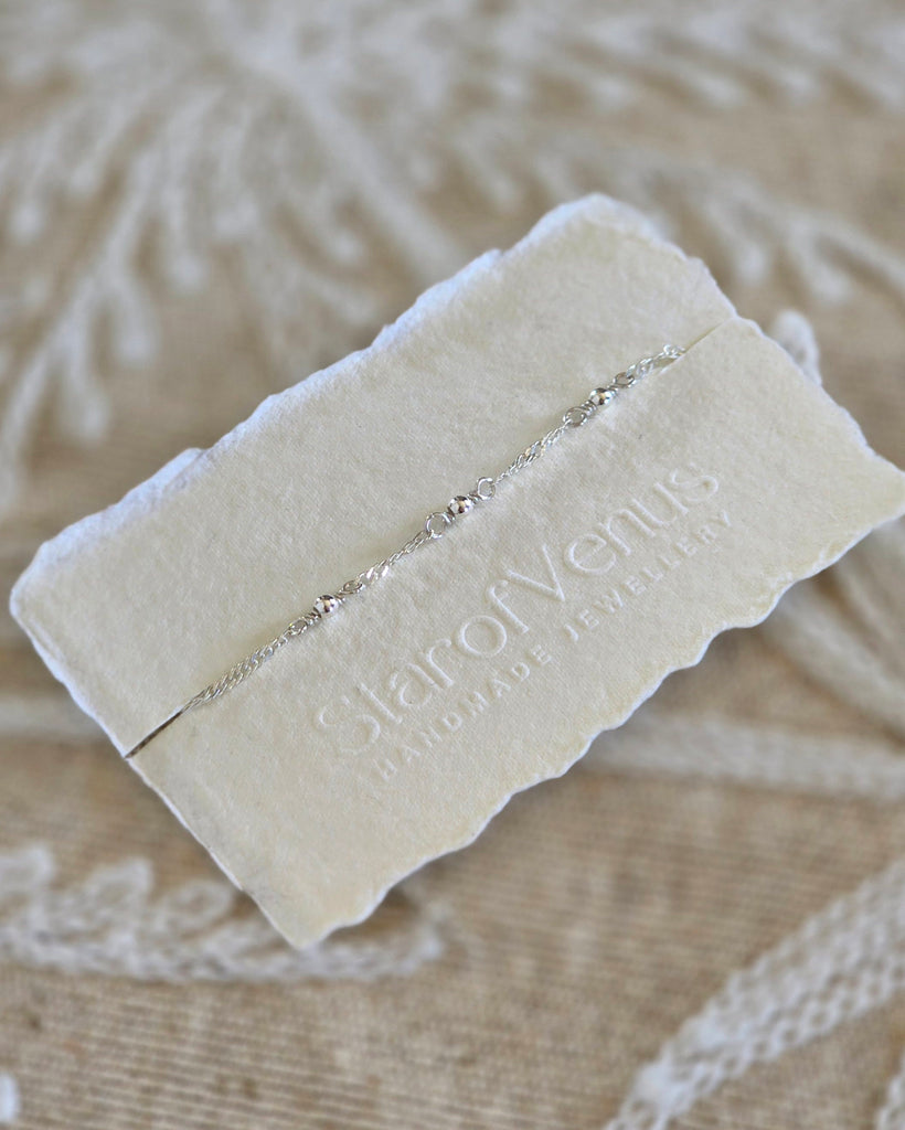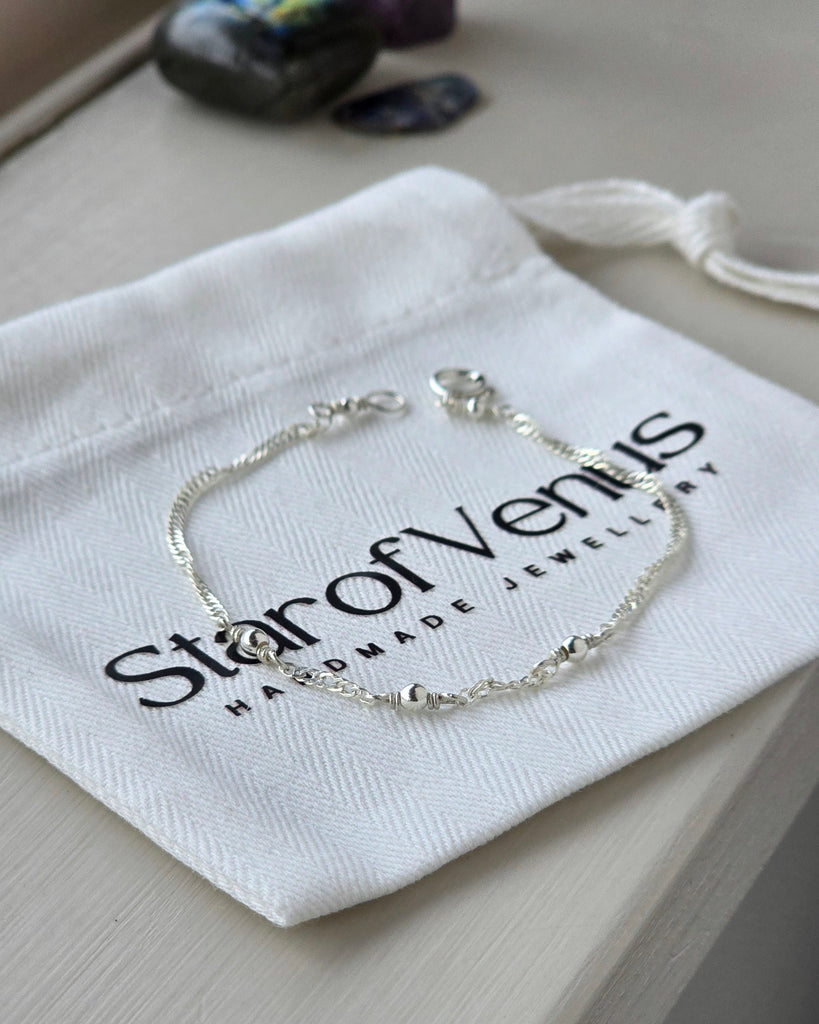 A stunning silver bracelet, handmade using a wave-style chain that gives flow and movement, with the addition of 3 tiny silver beads. Perfect for everyday, or layered with other bracelets for an evening look. Like the moon, silver offers illumination, wisdom and healing.