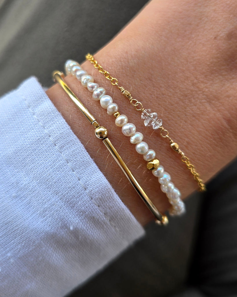 Simple and charming pearl bracelet with golden accents. Handmade in New Zealand with genuine pearls. Only 2 available, 16cm with 3cm extension chain. Comes beautifully wrapped!